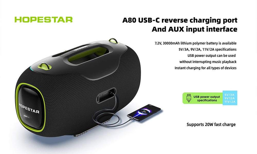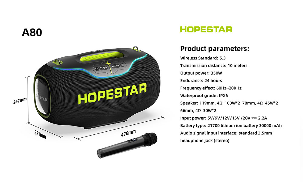 اسپیکر بلوتوثی Hopestar A80 یک غول صوتی قابل حمل است که برای برپایی مهمانیهای پرشور و استفاده در فضای باز طراحی شده است. این مدل با ترکیب قدرت صوتی بسیار بالا، باتری با دوام استثنایی و قابلیتهای ارتباطی گسترده، انتخابی ایدهآل برای تبدیل هر جمعی به یک رویداد بهیادماندنی است.