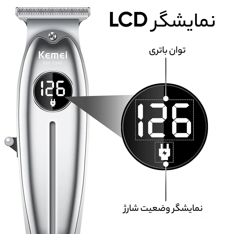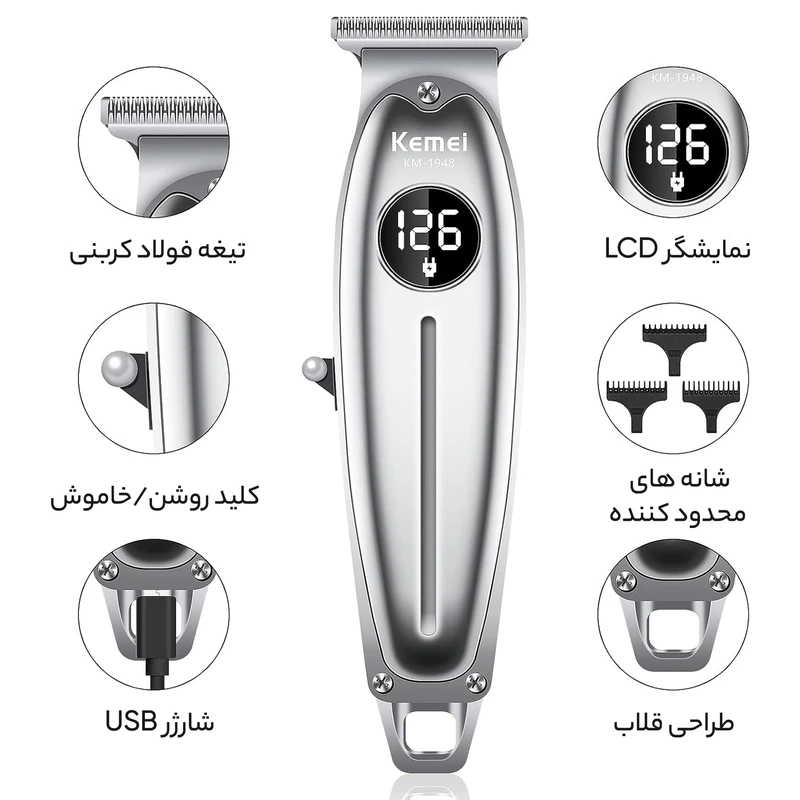 ماشین اصلاح حرفه‌ای کیمی مدل KM-1948 یک دستگاه خط‌زن و صفرزن بی‌سیم با بدنه تمام فلزی و فناوری برش مستقیم است. این دستگاه با طراحی ارگونومیک و نمایشگر LED، ابزاری ایده‌آل برای آرایشگران و افراد حرفه‌ای برای ایجاد خطوط دقیق و اصلاح صفر مو محسوب می‌شود.