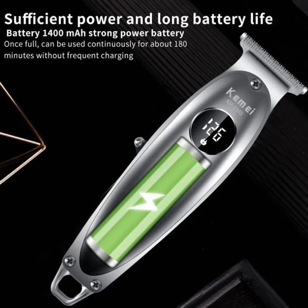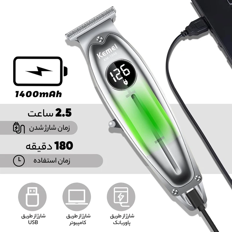 🔋 باتری با دوام و عملکرد بی‌سیم: ماشین اصلاح KM-1948 مجهز به یک باتری لیتیومی قابل شارژ با ظرفیت ۱۴۰۰ میلی‌آمپر ساعت است. این باتری پس از شارژ کامل، امکان ۱۲۰ تا ۱۸۰ دقیقه استفاده مداوم را فراهم می‌کند و شارژ آن از طریق پورت USB انجام می‌شود.