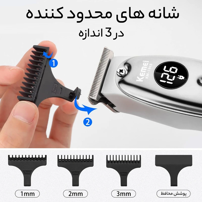 🧰 لوازم همراه: این دستگاه معمولاً با یک ست کامل لوازم جانبی ارائه می‌شود که شامل ۳ عدد شانه راهنما (برای تنظیم طول مو)، کابل شارژ USB، برس تمیزکننده، روغن مخصوص تیغه‌ها و درپوش محافظ است.