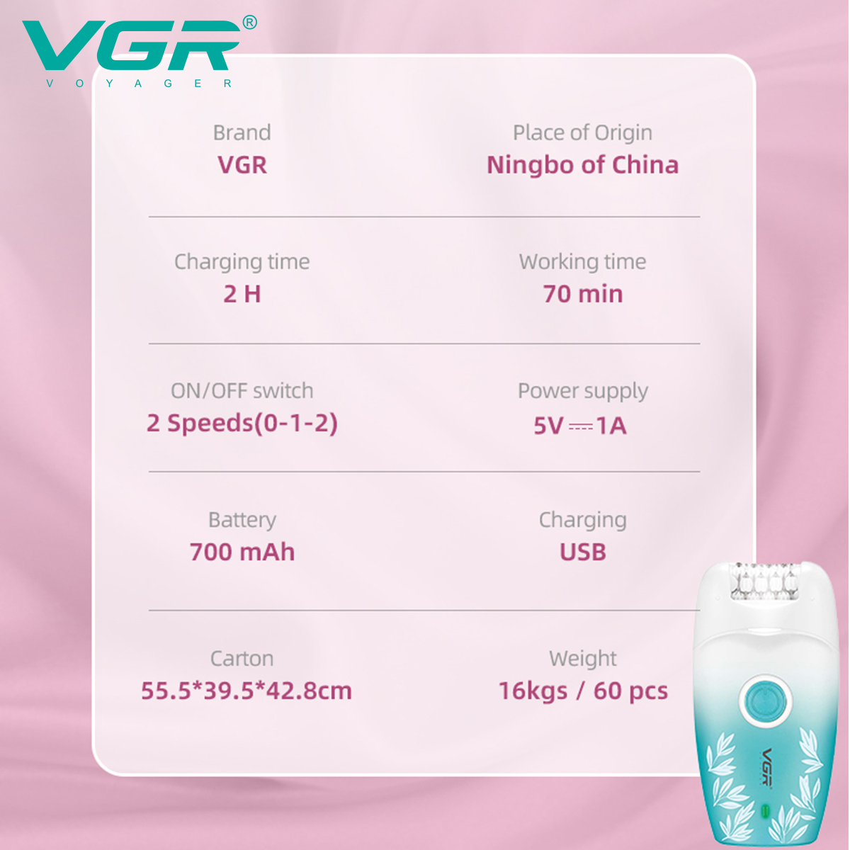 این محصول یک اپیلاتور بیسیم (شارژی) است و قابلیت استفاده در حالت باسیم را ندارد. ساخت آن در کشور چین و توسط شرکت Ningbo VGR Electric Appliance Co., Ltd. انجام شده است .