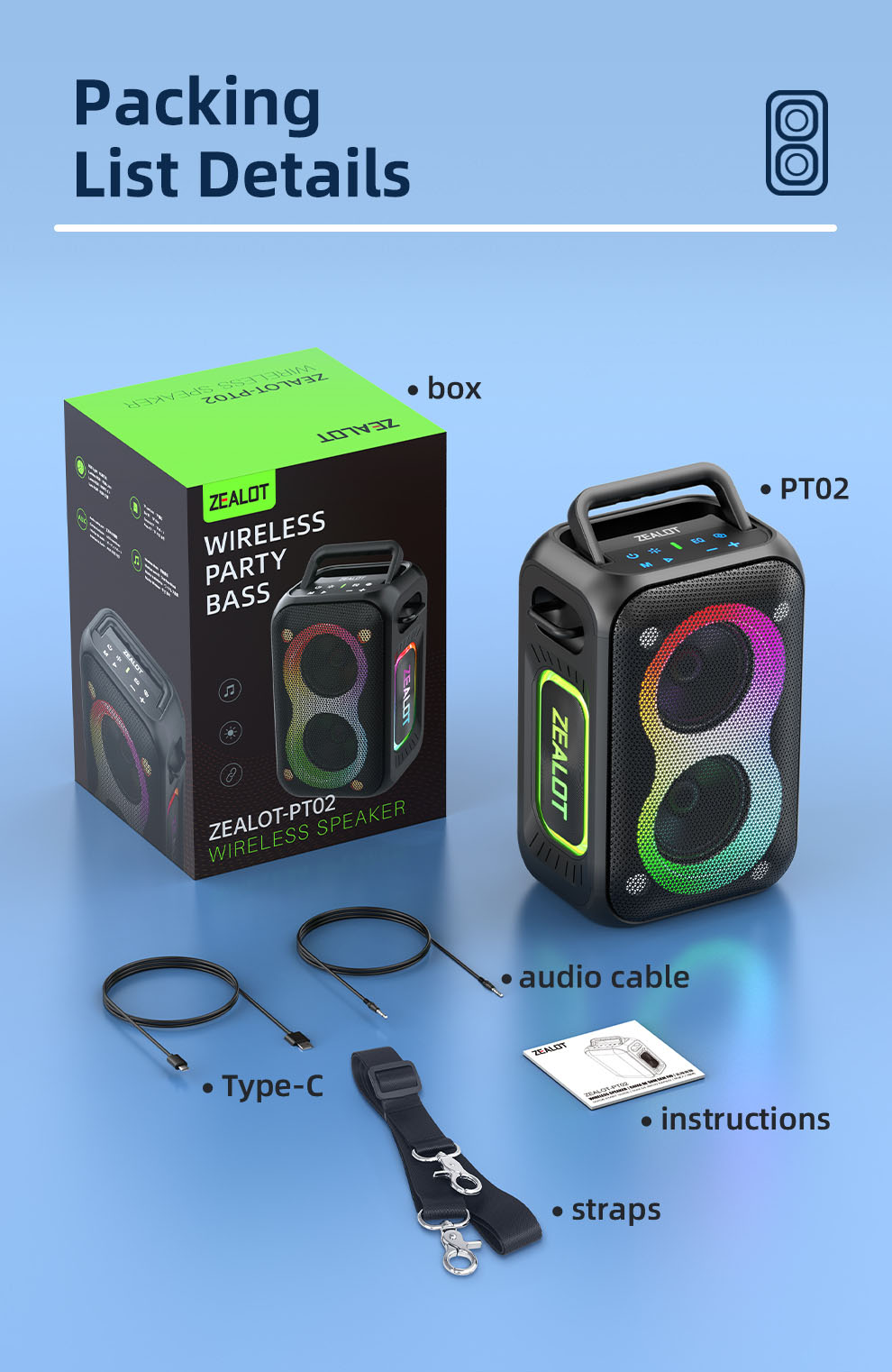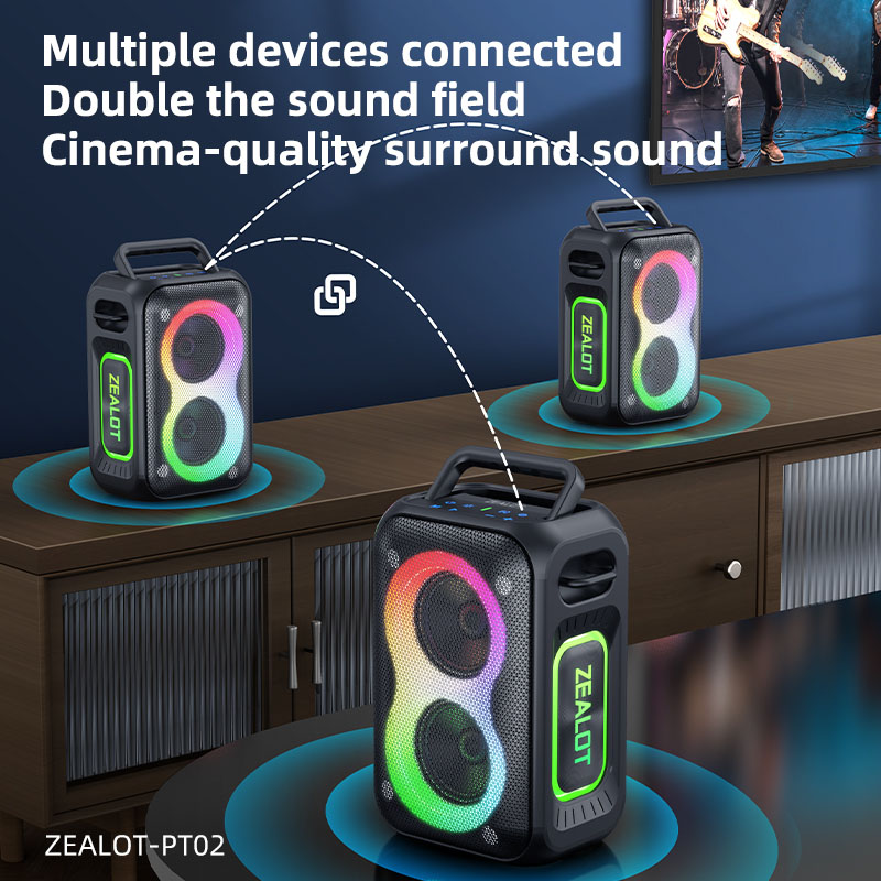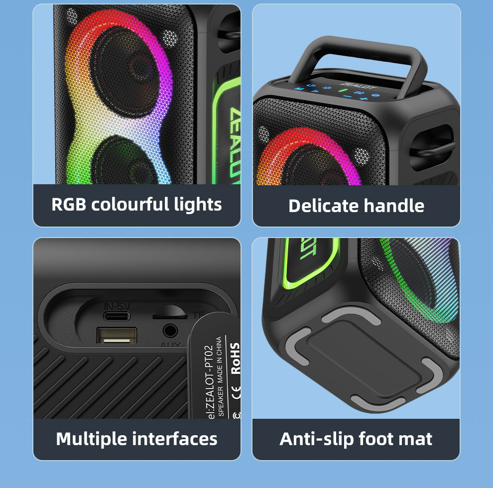 - هدف و مخاطب: Zealot PT02 برای کاربرانی طراحی شده که به دنبال تعادل عالی بین قدرت صدا، قابلیت حمل و قیمت هستند. این دستگاه برای مهمانیهای کوچک در خانه یا حیاط، استفاده در سفر، کمپینگ و حتی به عنوان اسپیکر رومیزی با قابلیت نورپردازی گزینهای ایدهآل است.